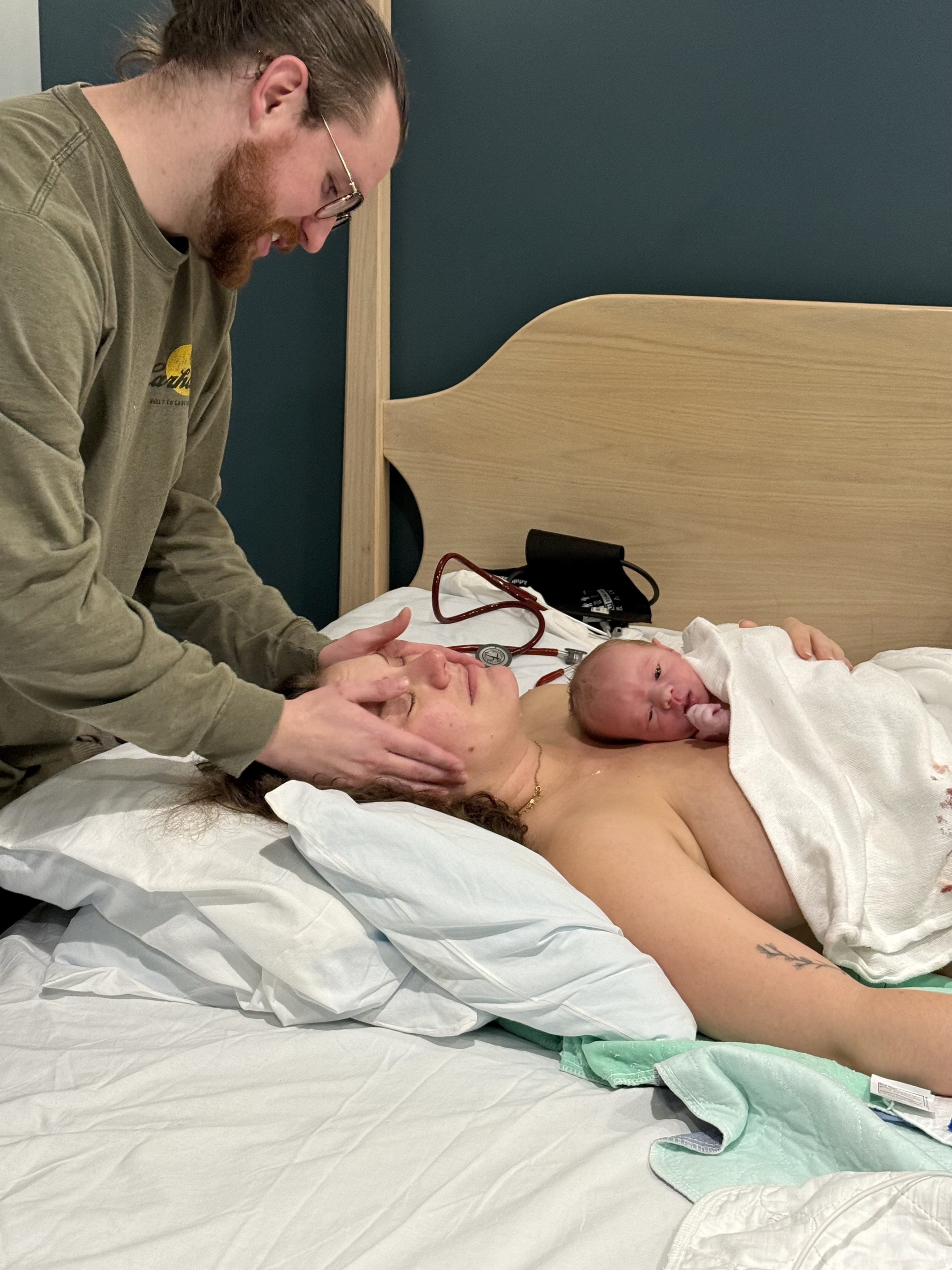 Nicole resting with her baby after birth. Her husband is massaging her head.